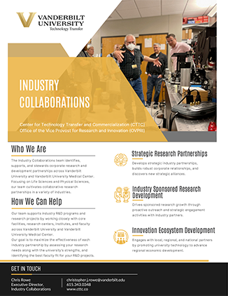 The Industry Collaborations team identifies, supports, and stewards corporate research and development partnerships across Vanderbilt University and Vanderbilt University Medical Center. Focusing on Life Sciences and Physical Sciences, our team cultivates collaborative research partnerships in a variety of industries. Our team supports industry R&D programs and research projects by working closely with core facilities, research centers, institutes, and faculty across Vanderbilt University and Vanderbilt University Medical Center.