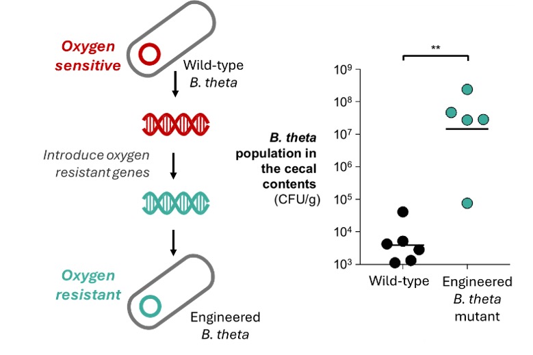 Left – Oxygen-resistant B. theta was engineered by introducing a suite of oxygen-resistant pathways. Right - In a mouse model of intestinal inflammation, engineered B. theta mutants survive better than wild-type strains.